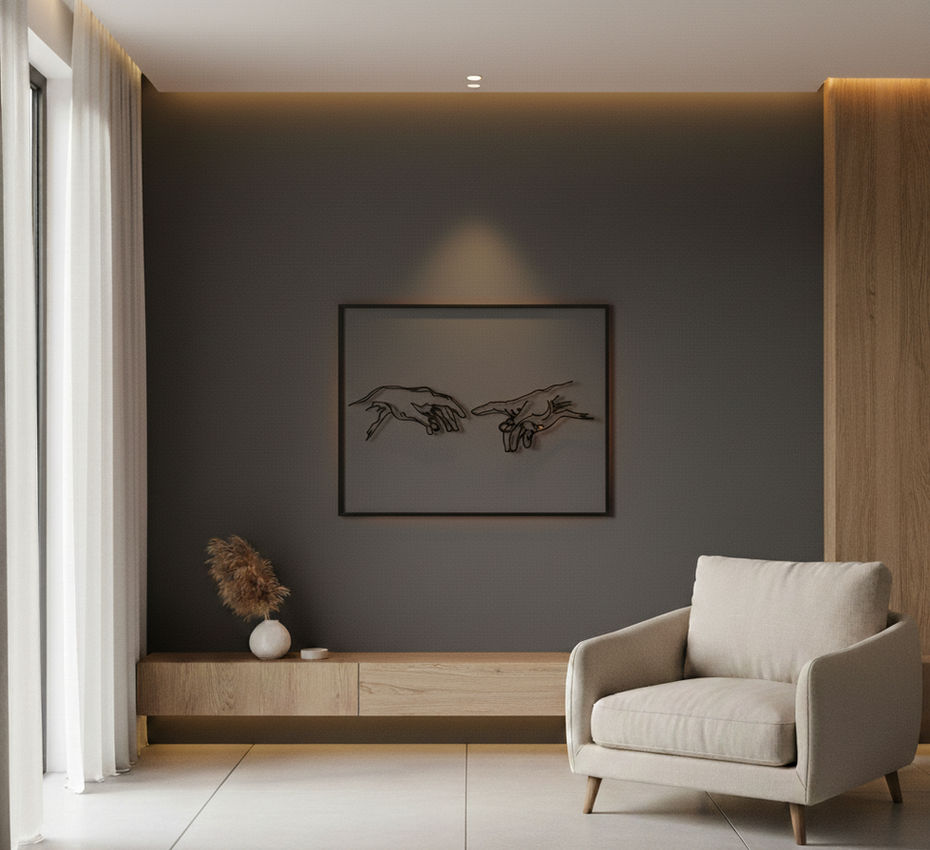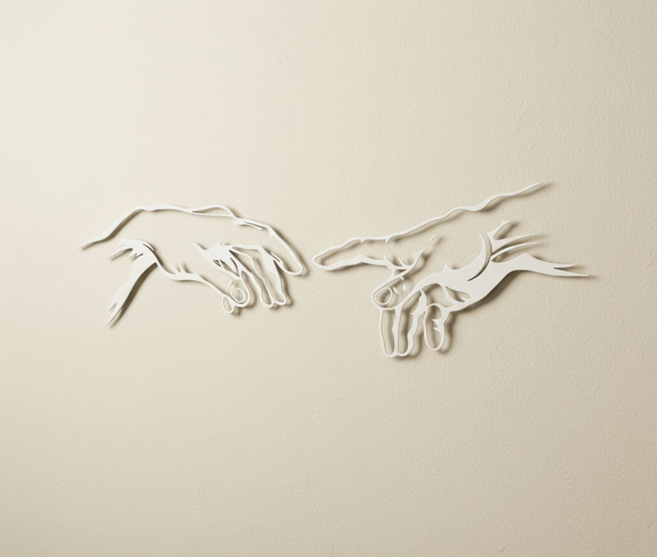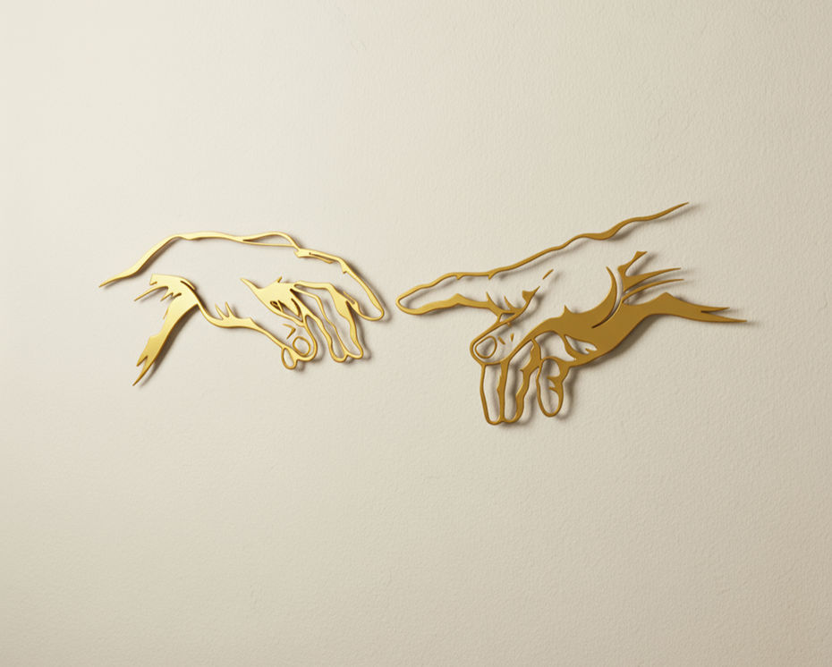 Questa scultura murale in ferro reinterpreta in chiave minimalista e contemporanea il celebre affresco di Michelangelo, "La Creazione di Adamo". È un pezzo d'arte dichiarativo, ideale per ambienti che ricercano un design sofisticato, un tocco di arte classica reinterpretata e un'atmosfera di profonda eleganza.